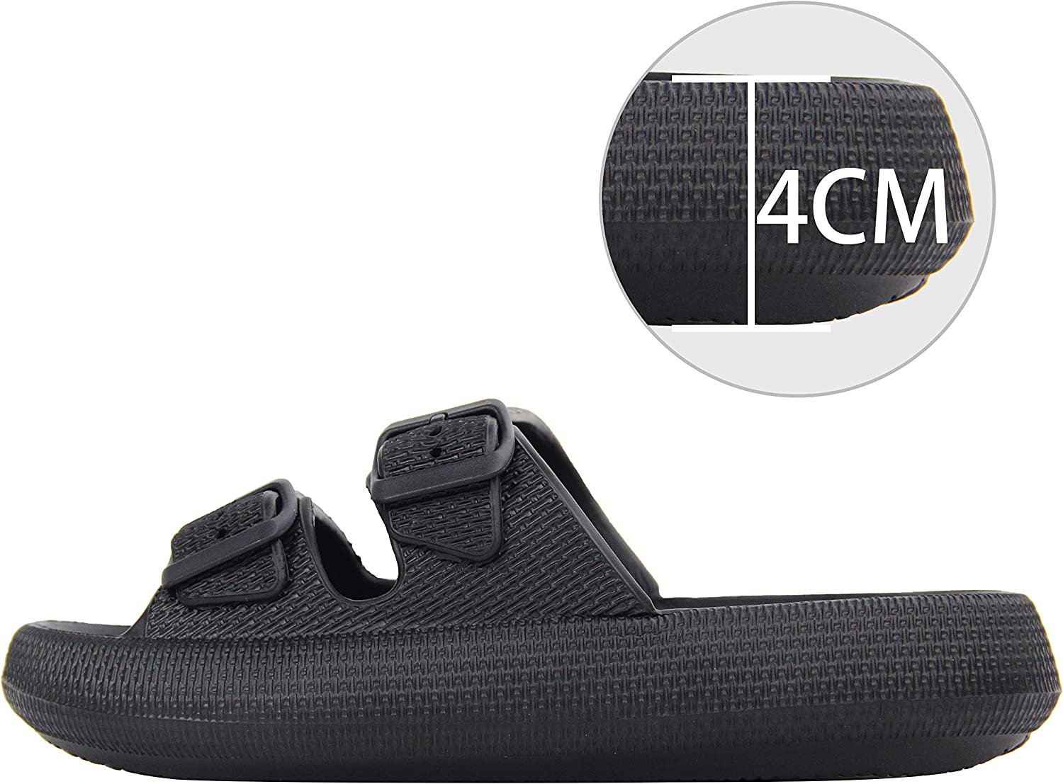 • Design: Offener Slide, breites Fußband, extra dicke Sohle