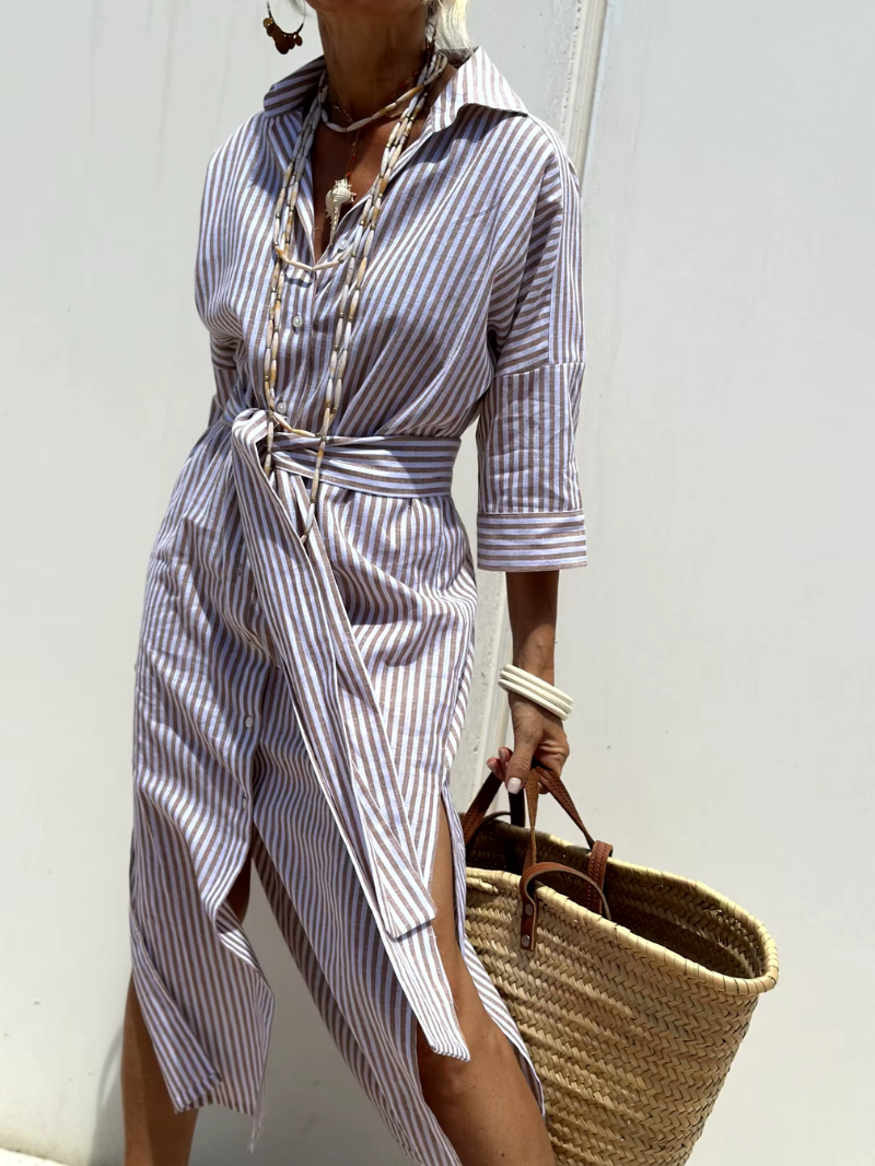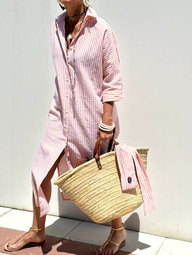 FELINDA vereint die klassische Raffinesse eines Hemdkleids mit dem frischen Charme modischer Prints. Mit ihrem Reverskragen, den durchgehenden Knöpfen und der passenden Taillengürtel ist sie die perfekte Wahl für Frauen, die gerne entspannt auftreten – ohne auf Stil zu verzichten.