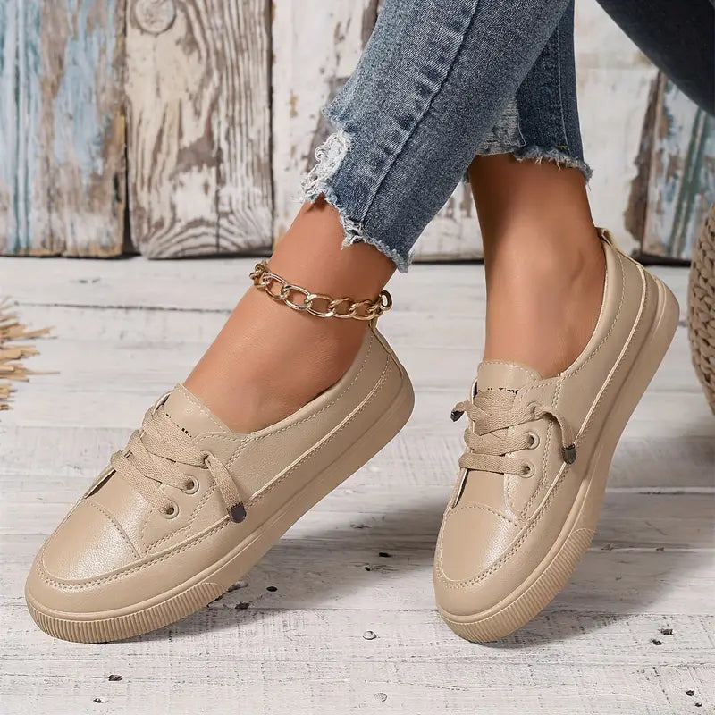 Die Slip-On-Sneakers für Damen sind der Inbegriff von lässigem Stil und Vielseitigkeit und damit ein Muss für Ihre Schuhsammlung. Diese flachen Low-Top-Skate-Schuhe sind für das ganze Jahr geeignet und verfügen über einen Schnürverschluss, der für eine sichere und verstellbare Passform sorgt und die perfekte Mischung aus Komfort und Bequemlichkeit bietet. Der schlichte Zehenstil verleiht ihnen einen eleganten und modernen Look, der sie zu verschiedenen Freizeitoutfits passt.