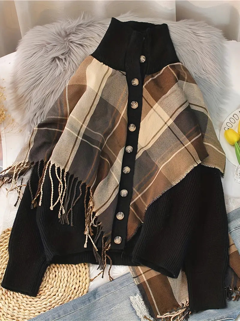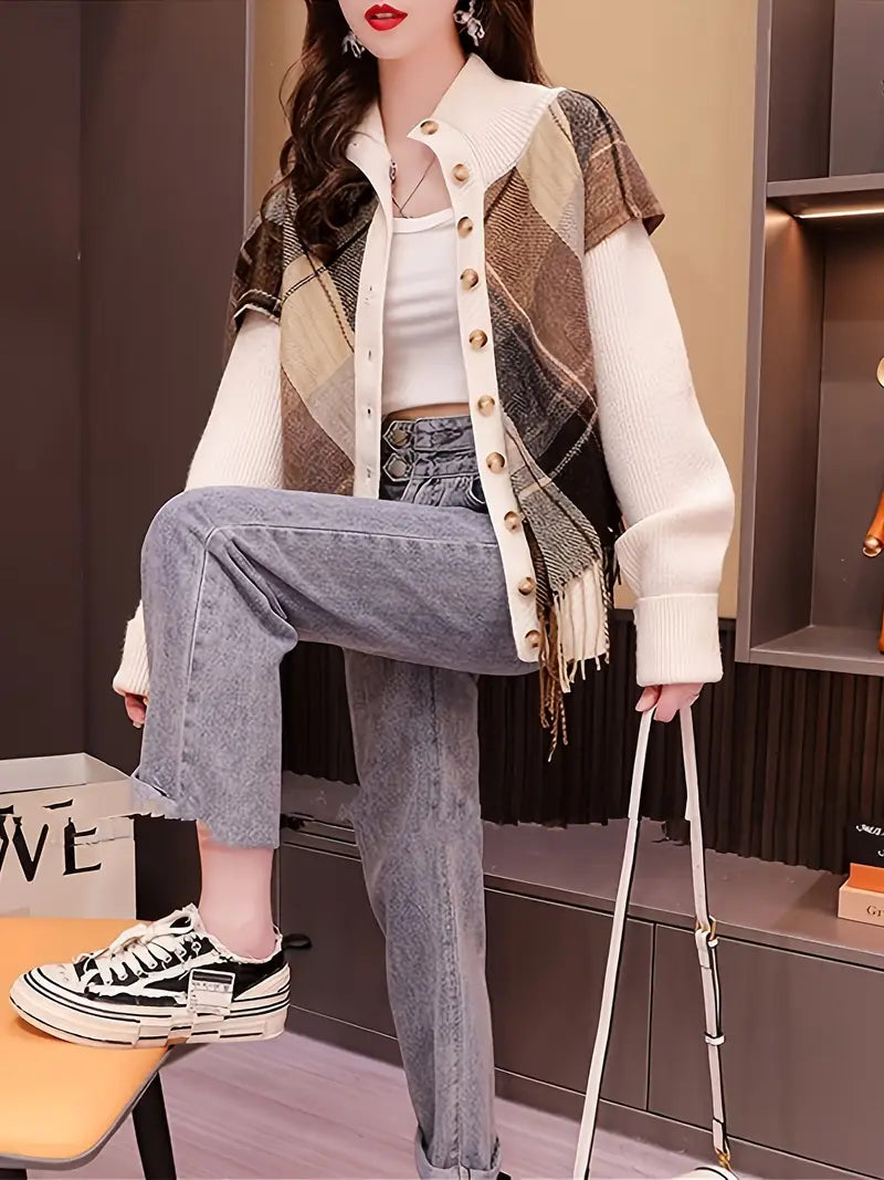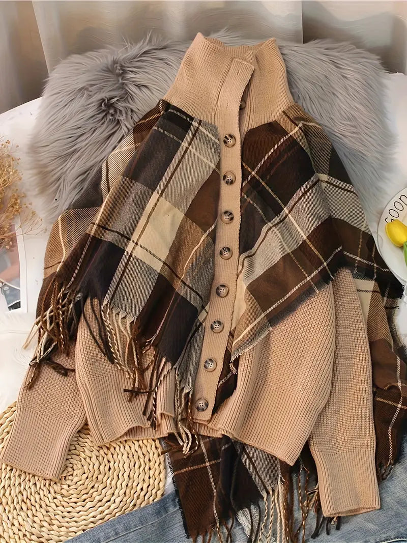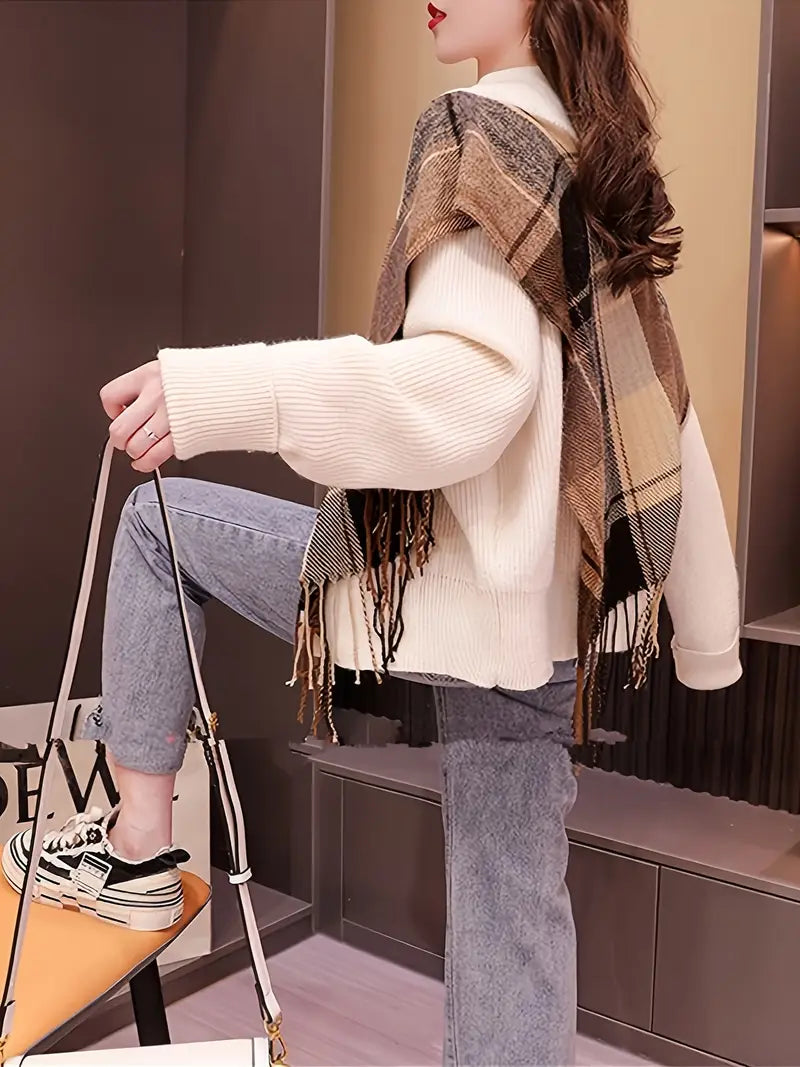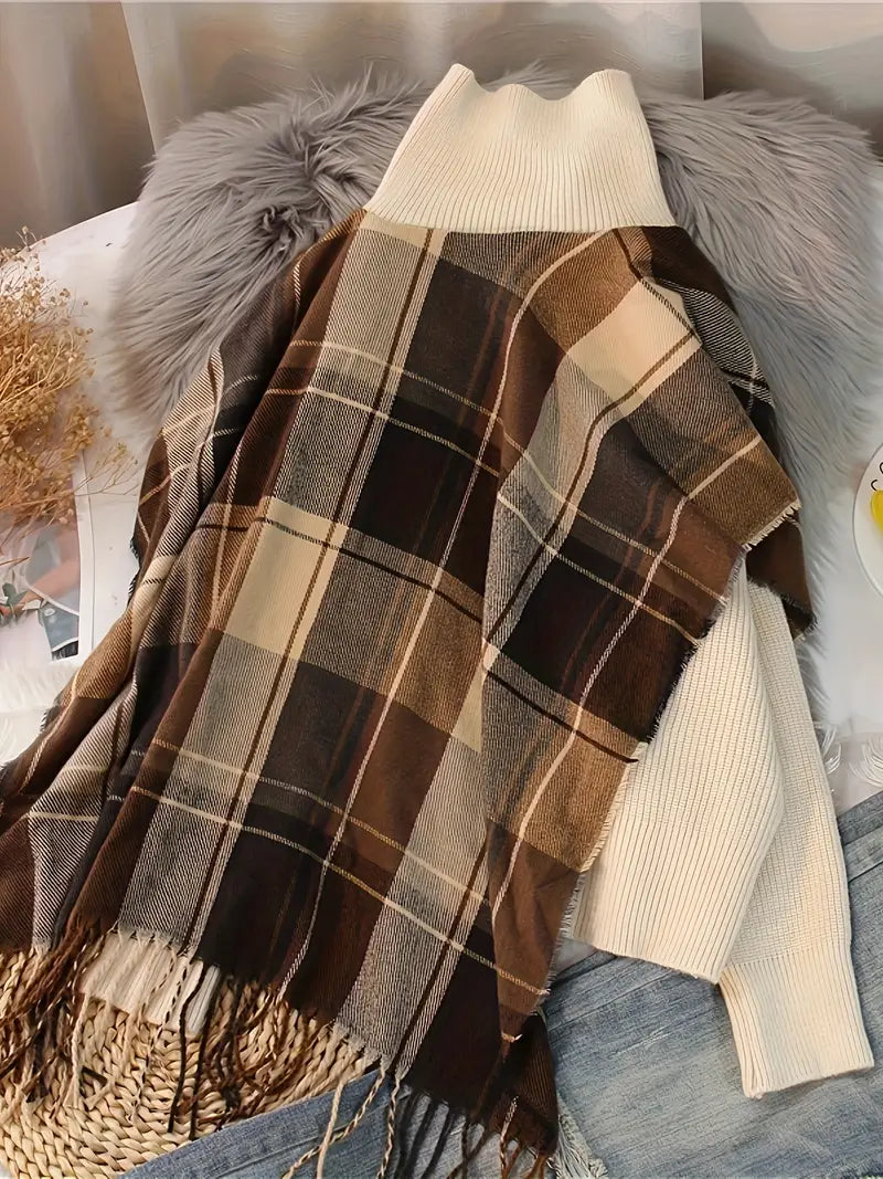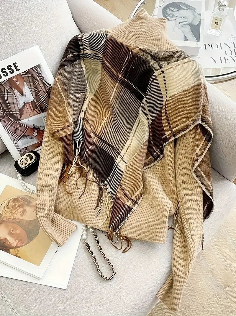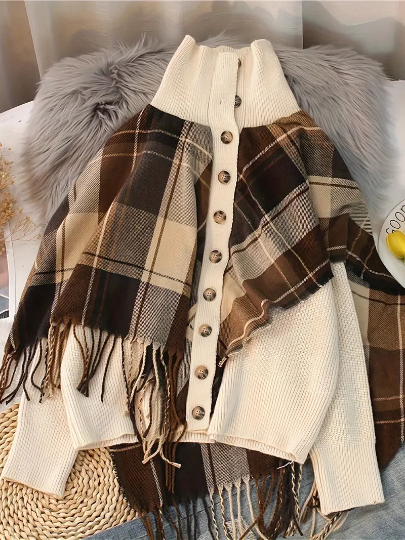 Dieses kuschelige und stilvolle Kleidungsstück besteht aus einem weichen Strickpullover aus hochwertigem Material für eine bequeme Passform, gepaart mit einem karierten Schal für zusätzliche Wärme und Raffinesse.