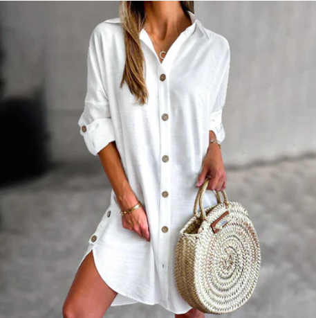 "Sofia, Hemdblusenkleid Strandperlenleinen: Ein elegantes Hemdblusenkleid aus leichtem Leinen, das durch seinen Strandperlen-Charme besticht. Perfekt für sommerliche Tage und entspannte Eleganz."