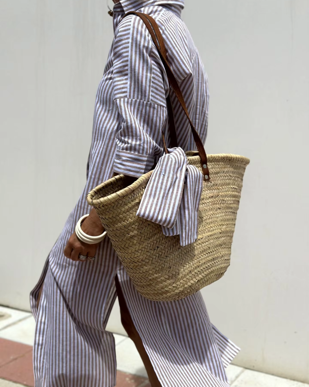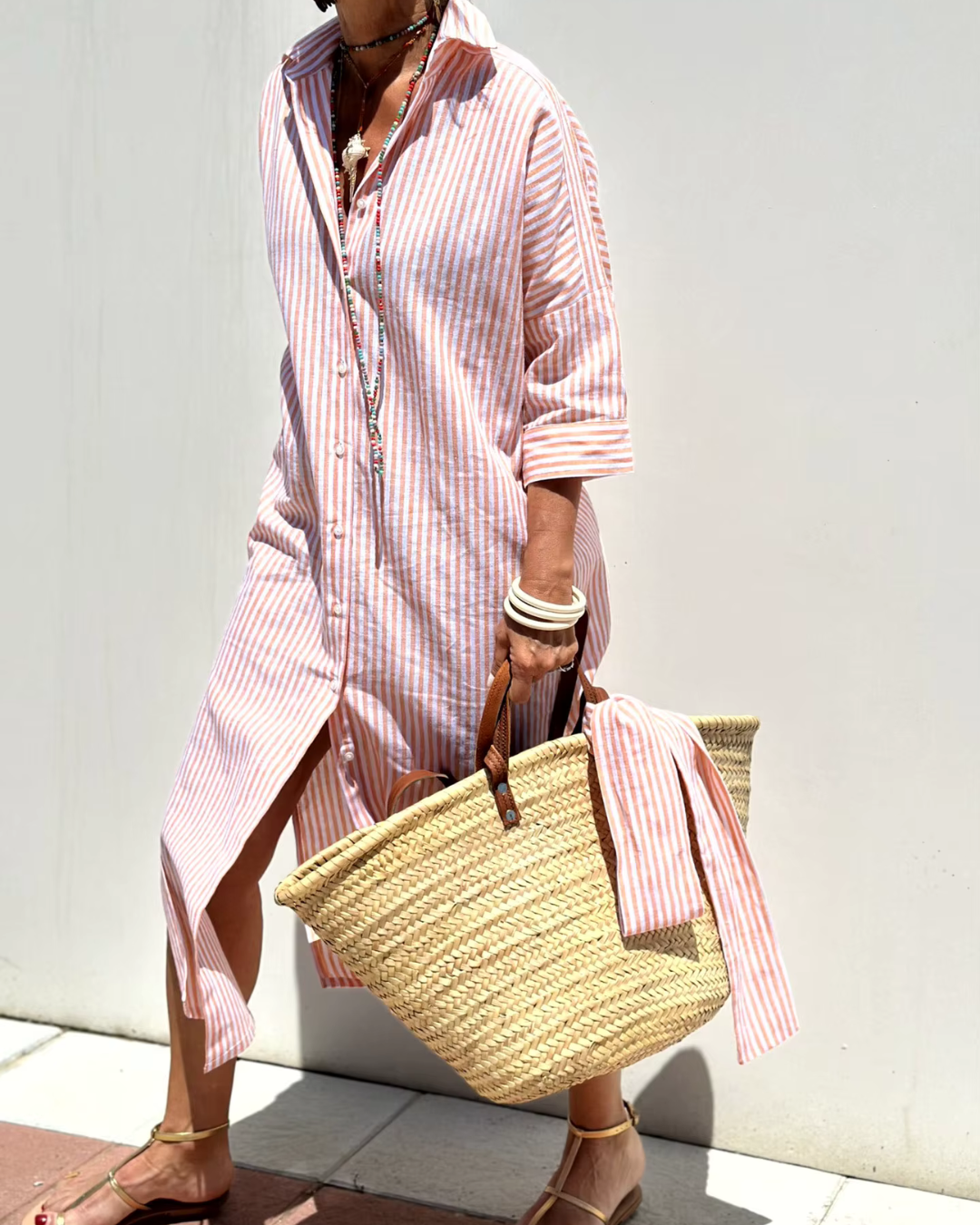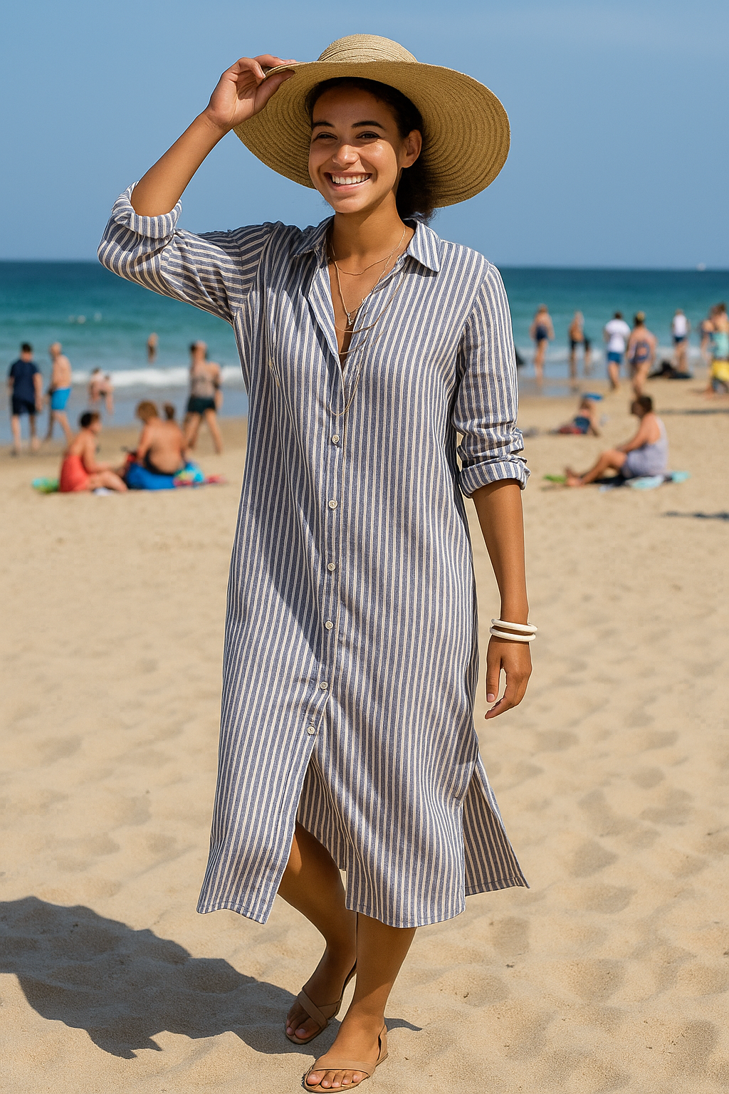 Ob mit Sandalen, Strohhut oder Basttasche – dieses Hemdkleid ist ein echter Styling-Allrounder. Es lässt sich offen als Überwurf oder geschlossen als Kleid tragen und passt sowohl zum Shoppingtag als auch zum Aperitif am Meer.