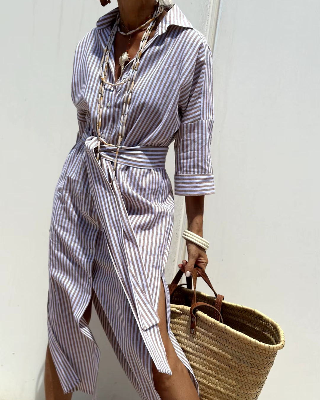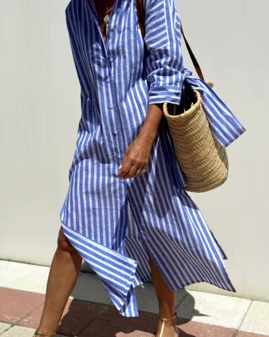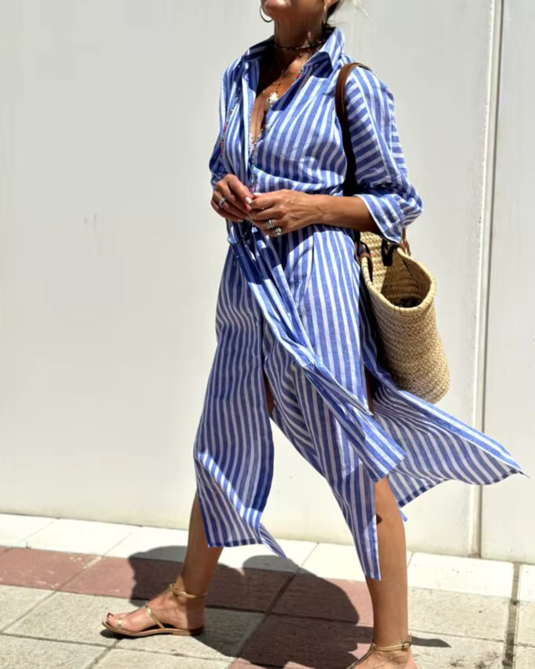 Ob mit Sandalen, Strohhut oder Basttasche – dieses Hemdkleid ist ein echter Styling-Allrounder. Es lässt sich offen als Überwurf oder geschlossen als Kleid tragen und passt sowohl zum Shoppingtag als auch zum Aperitif am Meer.