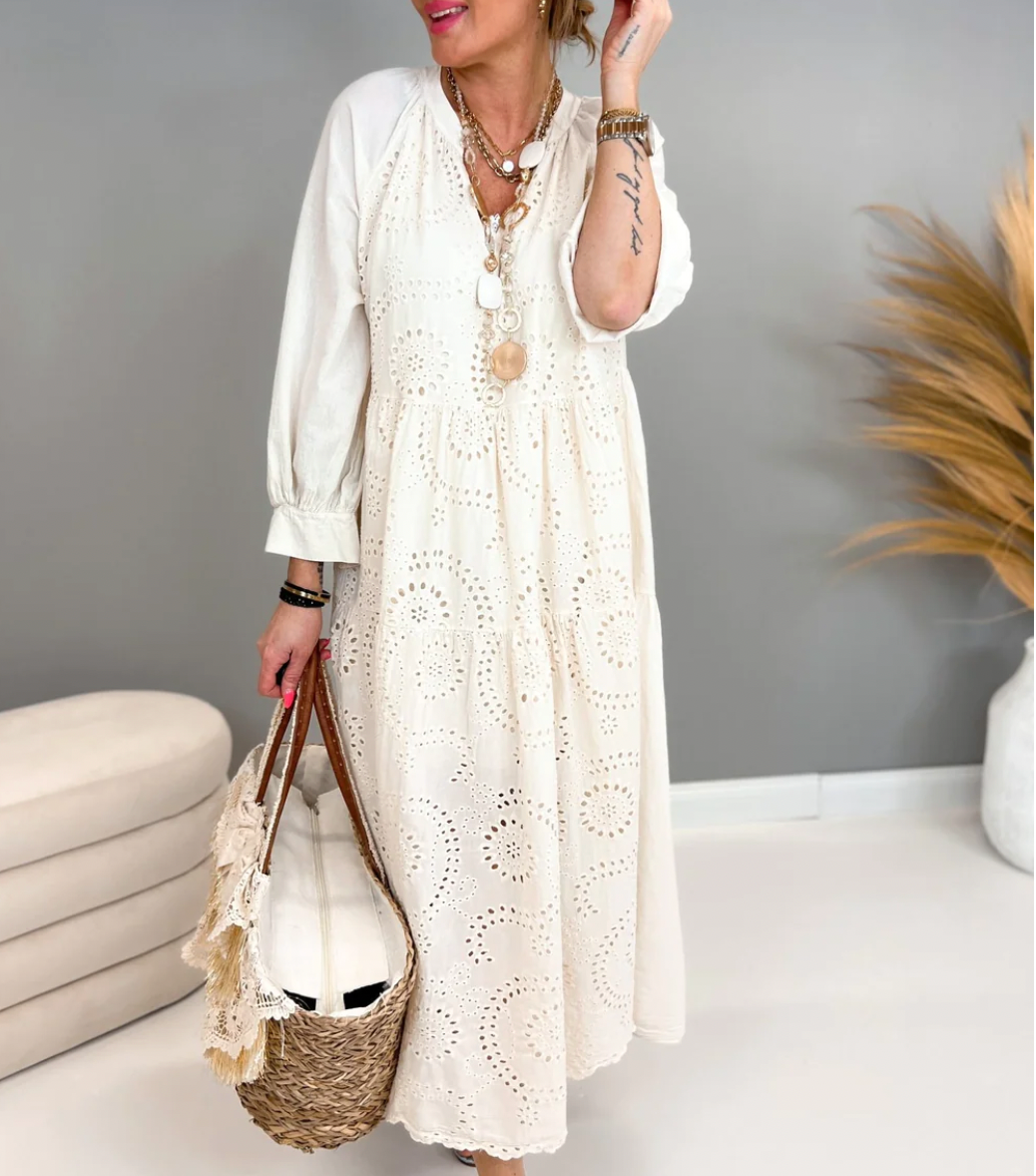 langes Sommerkleid für Damen mit langen Ärmeln in der Farbe Beige mit wunderschöner Stickerei