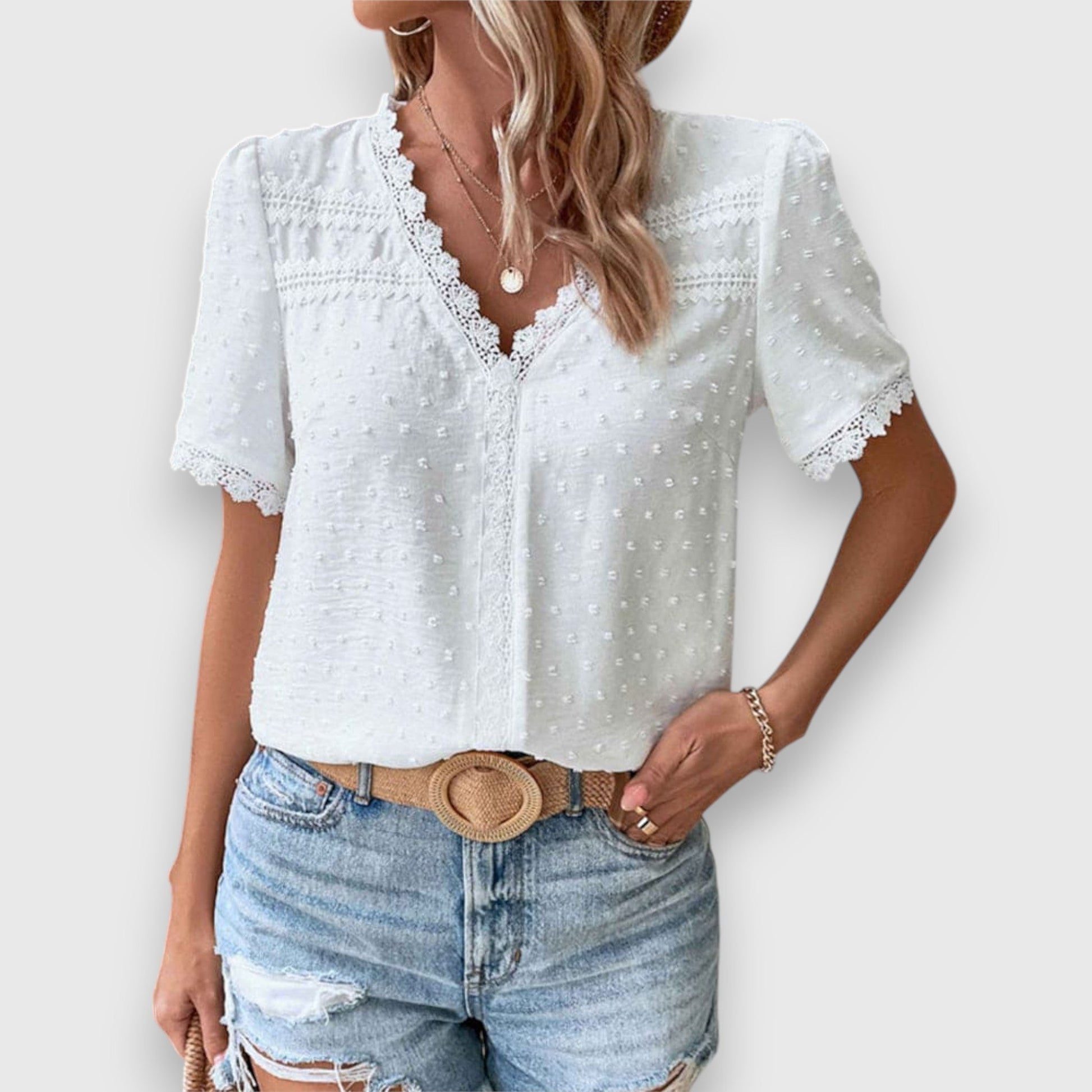 Das Wassa Spitzenbluse verbindet feine Spitze mit einem modernen Schnitt und verleiht deinem Outfit eine elegante Leichtigkeit. Mit seinen kurzen Ärmeln und der zarten Struktur ist es ideal für warme Tage mit stilvollem Anspruch.